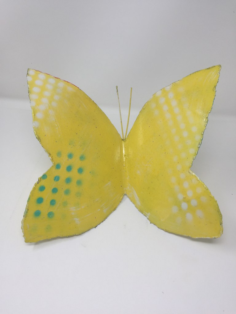circle bird with blue flower $125 (6″d x 6″h x chain length)-soldyellow butterfly $38 (6″d x 11=12″w x 10″h) – screw welded on back to attach to wall or tree-available through my studio and Troika Gallery