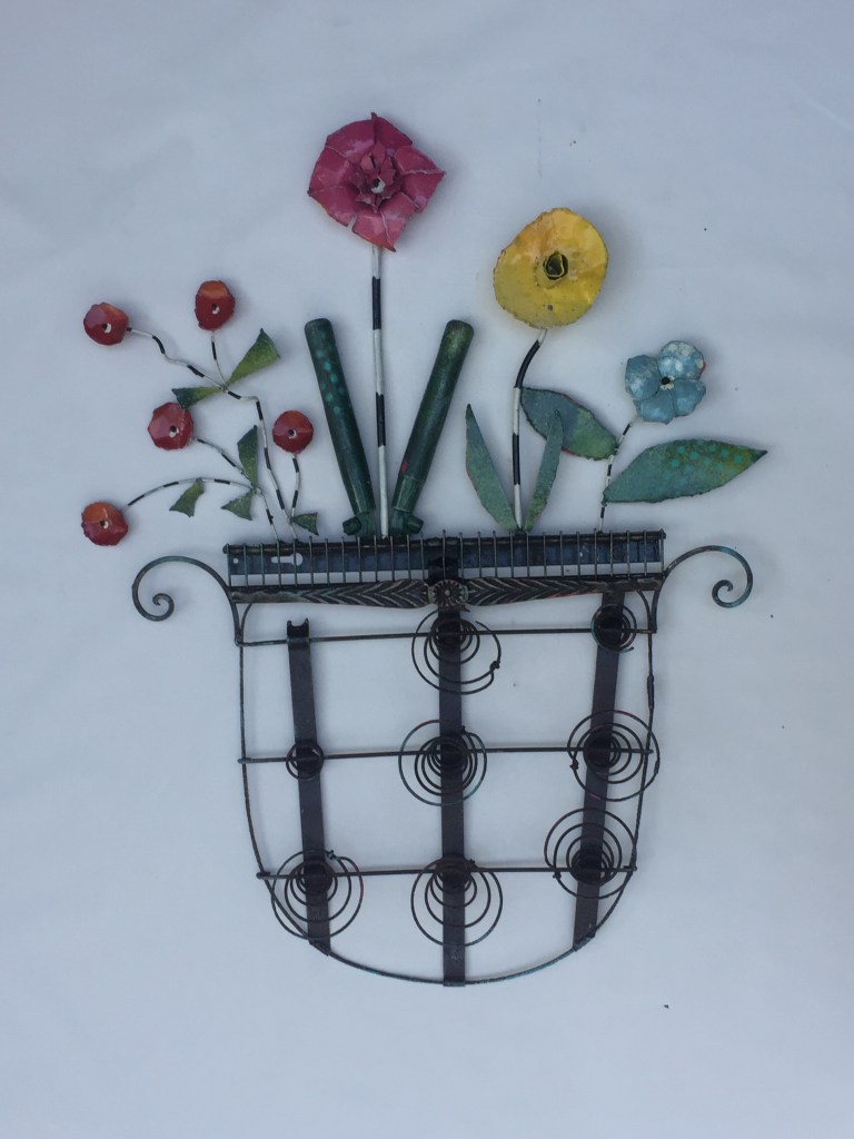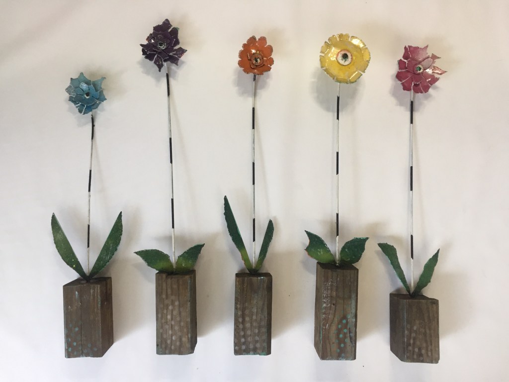 flower basket on tractor seat $525 (40″h x 32″w x 4″d) blue four pedal flower $85 (16″h x 8″w x 3″d) available at Troika Gallerywall flower blocks $115 ea. (@20″h x4″d x8″w) blue/purple/orange/yellow/pink available at Troika Gallery